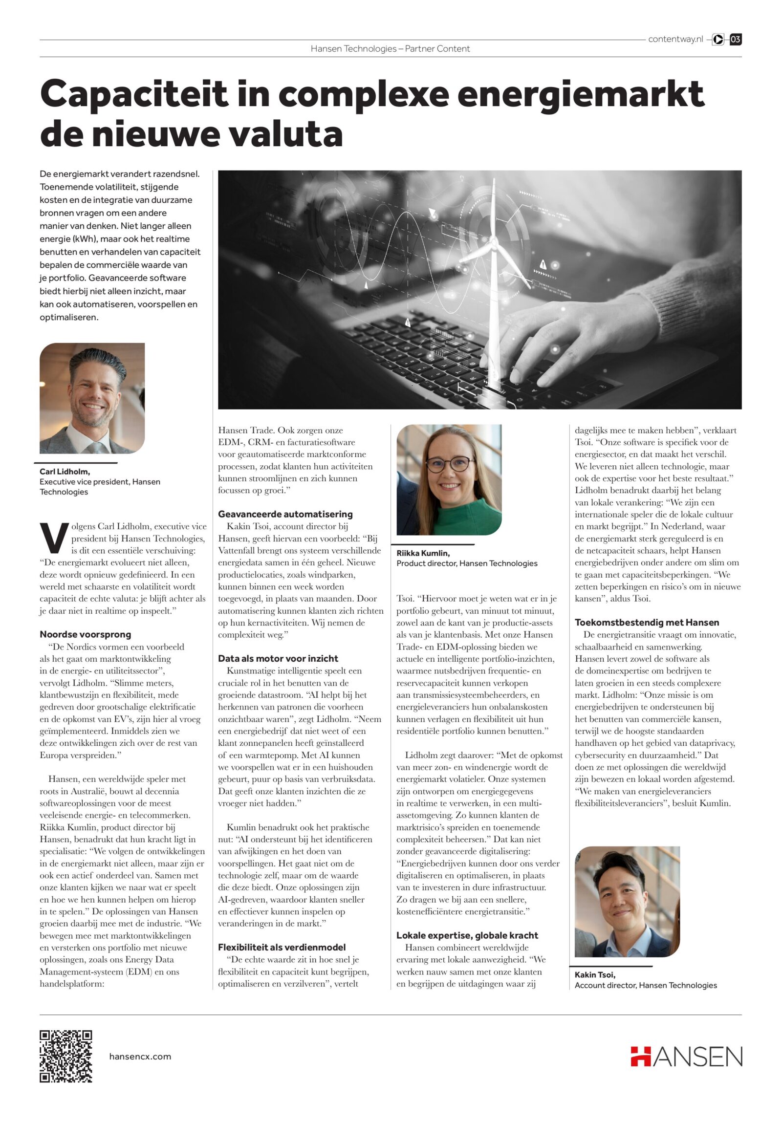 Hansen combines global experience with a local presence. “We work closely with our customers and understand the challenges they face every day,” explains Tsoi. “Our software is tailored specifically for the energy sector, and that makes all the difference. We deliver not only technology, but also the expertise needed to achieve the best results.” Lidholm emphasises the importance of local roots: “We are an international player that understands the local culture and market.” In the Netherlands, where the energy market is highly regulated and grid capacity is scarce, Hansen helps energy companies, among other things, to manage capacity constraints effectively. “We transform constraints and risks into new opportunities” says Tsoi.